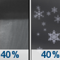 Temperature: 41°F Wind Speed: 7 mph Wind Direction: SSE Forecast: Showers and thunderstorms likely. Mostly cloudy. Low around 41, with temperatures rising to around 44 overnight. South southeast wind around 7 mph. Chance of precipitation is 70%. |