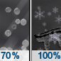Temperature: 41°F Wind Speed: 5 to 10 mph Wind Direction: NNE Forecast: A chance of snow showers between 7am and 10am, then rain and snow showers likely between 10am and 2pm, then rain and snow showers likely. Mostly cloudy, with a high near 41. North northeast wind 5 to 10 mph. Chance of precipitation is 70%. New rainfall amounts between a tenth and quarter of an inch possible. |