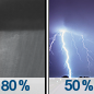 Temperature: 56°F Wind Speed: 10 mph Wind Direction: SE Forecast: Showers and thunderstorms. Cloudy, with a low around 56. Southeast wind around 10 mph. Chance of precipitation is 80%. |