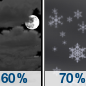 Temperature: 25°F Wind Speed: 3 to 10 mph Wind Direction: SSW Forecast: A chance of snow between noon and 4pm. Cloudy, with a high near 25. South southwest wind 3 to 10 mph, with gusts as high as 21 mph. Chance of precipitation is 60%. New snow accumulation of less than half an inch possible. |