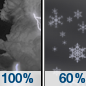 Temperature: 32°F Wind Speed: 14 to 20 mph Wind Direction: W Forecast: Rain and a slight chance of thunderstorms before 2am, then a slight chance of rain and snow. Mostly cloudy, with a low around 32. Chance of precipitation is 100%. |