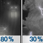 Temperature: 37°F Wind Speed: 5 mph Wind Direction: W Forecast: Rain before midnight, then a chance of rain and a slight chance of thunderstorms. Mostly cloudy, with a low around 37. Chance of precipitation is 80%. |