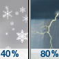 Temperature: 31°F Wind Speed: 15 mph Wind Direction: NNW Forecast: Showers and thunderstorms. Cloudy, with a low around 31. North northwest wind around 15 mph. Chance of precipitation is 80%. New rainfall amounts between a quarter and half of an inch possible. |