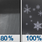 Temperature: 35°F Wind Speed: 12 to 17 mph Wind Direction: W Forecast: Rain and snow showers before 7am, then snow between 7am and 1pm, then snow showers. Cloudy, with a high near 35. West wind 12 to 17 mph, with gusts as high as 32 mph. Chance of precipitation is 100%. New snow accumulation of 2 to 4 inches possible. |